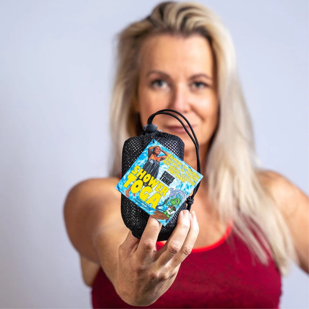 - Say goodbye to awkward changing situations and gross public camping/beach stations with Shower Toga.