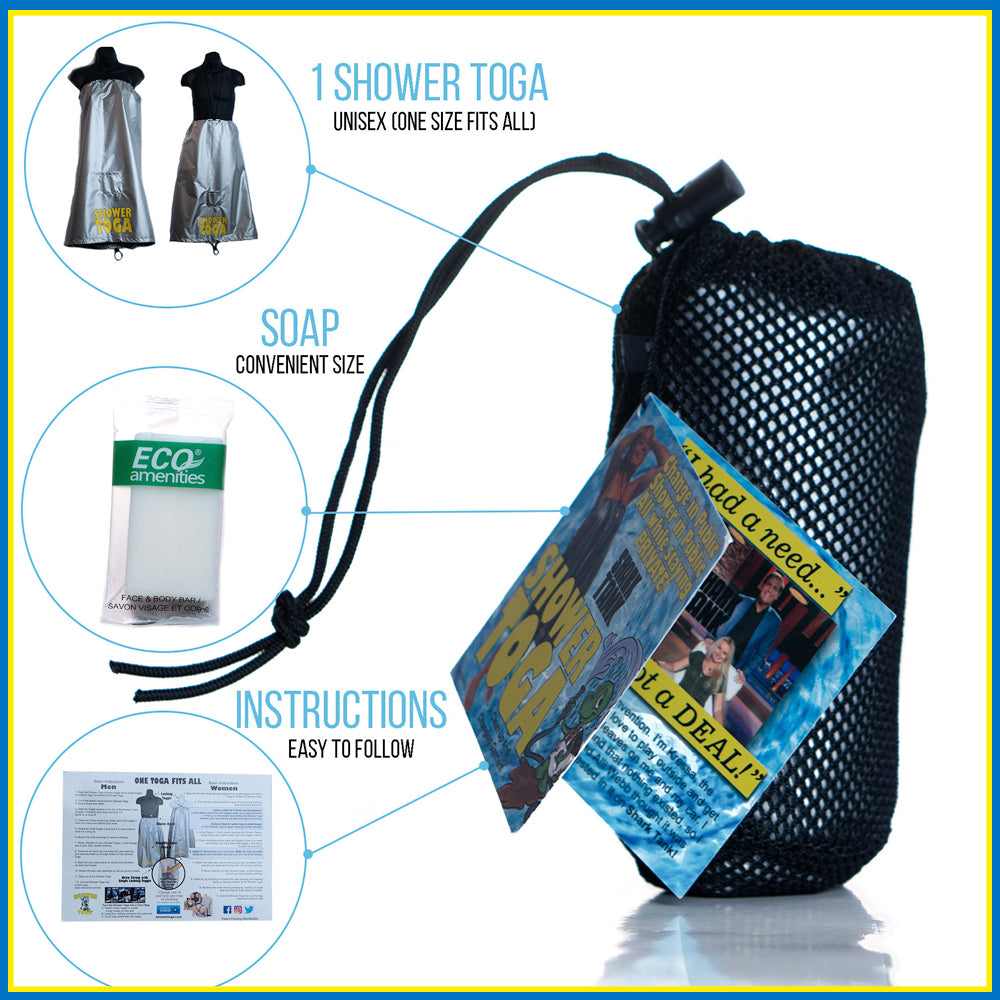Package includes 1 Shower Toga & 1 Shower To-Go shower bottle topper so you are ready for anything that comes your way!
