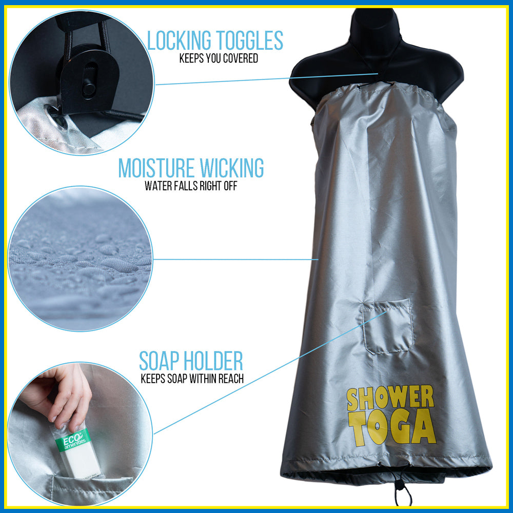 The unisex Shower Toga is a innovative 5 ounce, high quality, patent pending, coated nylon wearable product for changing, showering and redressing. Shower Toga doubles as a bag for your dirty clothes, or wet suit, allowing you to keep your car clean and dry. Cleaning up after activities has never been easier.