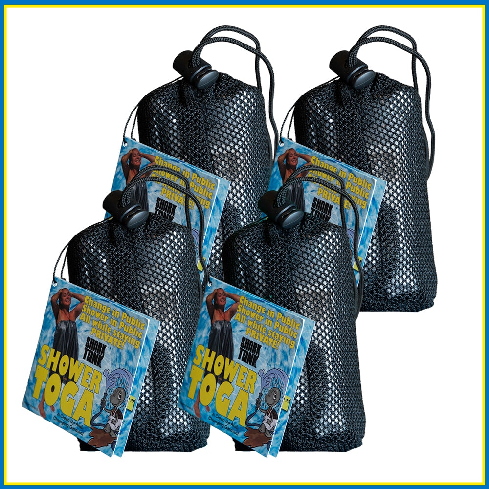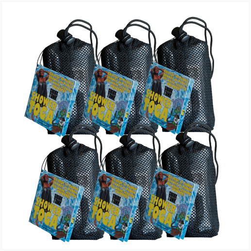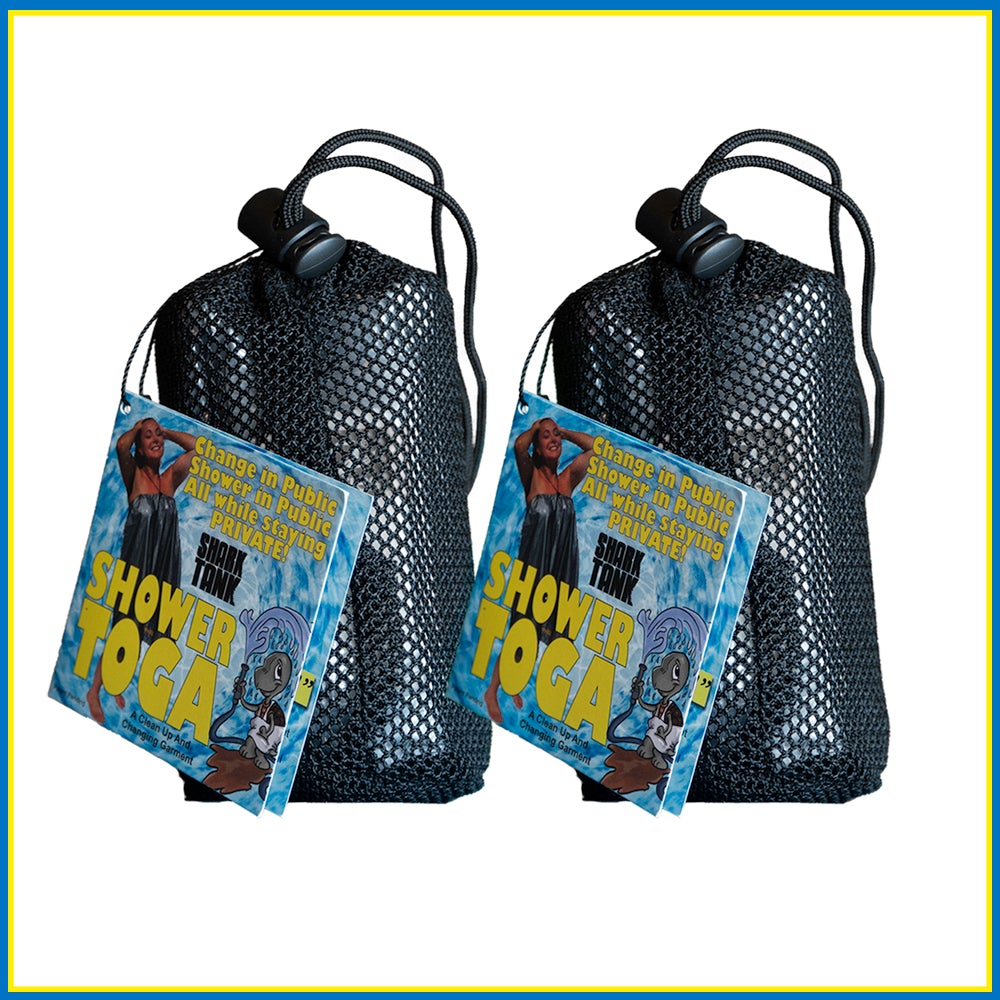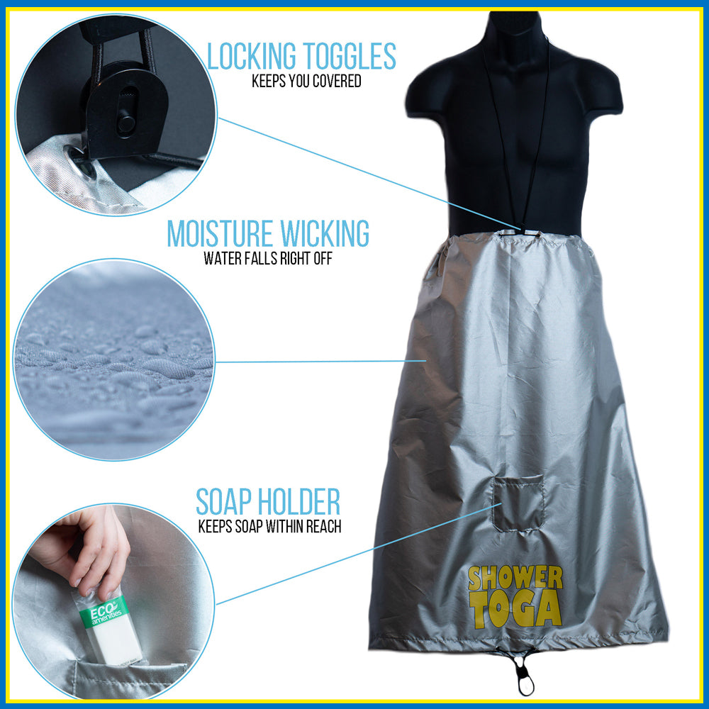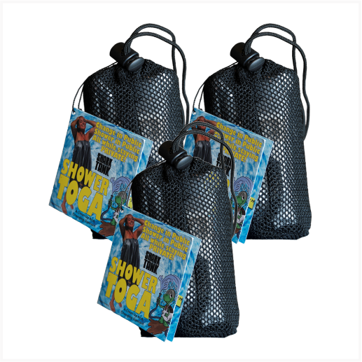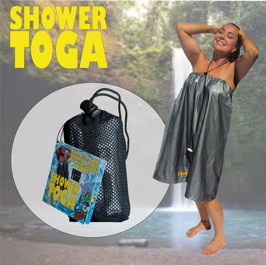 The unisex Shower Toga is a innovative 5 ounce, high quality, patent pending, coated nylon wearable product for changing, showering and redressing. Shower Toga doubles as a bag for your dirty clothes, or wet suit, allowing you to keep your car clean and dry. Cleaning up after activities has never been easier.